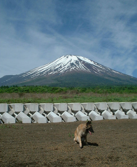 富士山のふもと、冬眠からさめて穴からはいずり出てきた腹ぺこキツネ