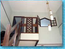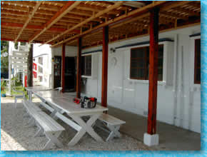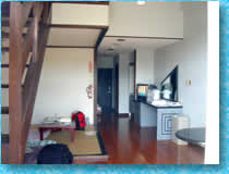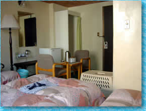 | 各部屋にユニットバスがついて、学生が合宿で使うような田舎の雑魚寝ペンションとは違います。もちろん朝晩2食付き。僕らはシーズンオフの貸し切り状態だったので、幸運にも150%くらいのフルサービスを受けることが出来ました。ひとことで言うなら「おいしかった!」。 01年の秋に台風でかなりの被害を受けたそうで、実はウッドデッキもすべて作り替え。GWに間に合わせるべく、オーナー自ら修復の真っ最中なのでした。 |