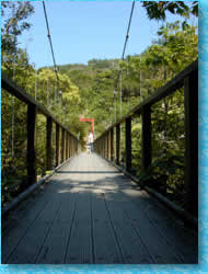 | 珍しく事前にネットでチェック、写真を見て、面白そうだから行ってみるか!決めていたのが比地(ひじ)大滝。駐車場から山道、吊り橋、遊歩道を1.4km、歩いた先に滝。犬の散歩にもってこい。当たり前のようにもくれんは楽しそう、人間は「・・・まだ半分か」。遊歩道(ボードウォーク)が整備されているとはいえ、上り下りの階段がキツイ。ほとんどトレッキングコース。Tシャツで汗をかきながら、やっと滝壺到着。涼しー。足下はささくれだった大岩がゴロゴロ、しかも濡れていて滑〜る。ヒトも犬も歩きにくくて、岩の上で一服したらもう動けない感じ。 |
