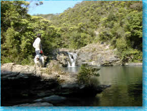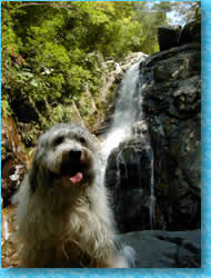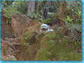 | 下までの距離は短くて、着いたところは森の中、ポカッとひらけた滝壺。直径40mはありそうな天然巨大プール。しかも深さ12mって...絶対なにか棲んでる。ヌシが棲んでる。気をつけろよ、もくれん。言ったそばからツルツル岩に、足滑らせて水の中チャポン。何やってんだ毛玉。喰われるぞ。 車までの帰り道、来た道を戻るしかない登り道。壁と言っても差し支えないよな、やっぱり。人間は、場所によってはロープが頼り。じめじめ滑る足下に気を付けながらもくれんを見れば...どこで拾ったか銘木。くわえてぴょこたん登る登る。飼い主を先回りして、銘木で遊べ!とまでおっしゃるその余裕。ポイ!飼い主の足下へ投げつけたら、もちろん遙か下までコロコロコロコロ。転がっていくのを追いかけて、下る下る。拾って再び登る登る。濡れた足が見る見るうちに泥で赤く染まっていく...車にたどり着いたときにはすっかり、下半分が素焼きのシーサー。楽しかったなあ、もくれん。全く予想外の大満足だったな。 |