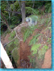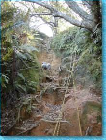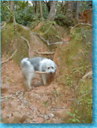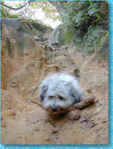 どういうことだ?気にしつつ、「順路」入り口らしきところにたどり着くと、木と木の間、赤土をえぐるようにほぼ垂直、下へと続く「通路」とロープ。なんだこれ。土石流の跡か?入り口の看板には、深くて冷たいので気をつけるように、と注意書き。植物の群落を見学するコースだろ?ハテナマークを出したまま方向転換、話を聞こうと学生クン達のところへ。「ちょっと聞いていい?」「はいどうぞ〜」明るい答えは嬉しいけれど、あることに気づく飼い主「・・・なんで君たち、濡れてるの?」。 「コースを外れなければ大丈夫っスよ」。彼らの言葉を信じ、しかしこの土石流跡はホントに「コース」なのか?イマイチ信じられぬまま、木の根を伝いロープを伝い先へ下へ。心配されたもくれんは、さすが4本足。ひょいひょいぴょんぴょん。落ちるも滑るも転がるも区別無し。身軽だな。いつも車に飛び乗れなくて、抱いてもらうまで待っているのはどこの誰だ。 |