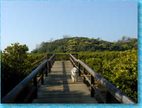 | マングローブで森林浴の後、またしばらくのんびりドライブ。道路ほぼ独り占め。阿波という集落を通り抜け、看板発見。タナガーグムイの植物群落・・・なんじゃそりゃ。よーするに変わった草がうじゃうじゃ生えている場所か?とりあえず看板の導くままに、ガタガタの未舗装路へ。このまま進むと獣道になって行き止まりそうな道路。その時はその時と突っ込んで、無事駐車場らしき場所に到着。 先客がいて、大学生くらいの男女5人組。ちょうど、車に戻ったところ。もくれんとともに「順路」入り口へ向かう飼い主の背中に女の子の気になる発言「わんちゃん、大丈夫かな?」。 |