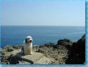 | 沖縄本島の最北端、辺戸岬。がけの上なので見晴らし抜群。日当たりも抜群。あ、暑い・・・。もくれんの濡れた足がどんどん乾いていく。それにしても、赤茶色に汚れていたのが何故乾くと白くなるのか?キレイになったような気がするのか?謎だ。 時は真っ昼間。日陰を見れば潜り込むもくれんでした。 |
