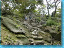 | やんばるも海のほうは、大自然の中にアカデミック(?)なスポットが点在。今帰仁(なきじん)の城跡をしっとりお散歩。山の上にがっしりと組み上げられた石垣、対してし場内は自然のままに荒廃しかつての建物は跡形も無し。 どうやら世界遺産らしいのですが・・・あちらこちらに、お勉強用の看板やら案内板やら立っていたのですが・・・ほとんど何も覚えてないな。犬がいて猫がいて、門前の茶店にあった団子と島バナナが美味かったことしか覚えてないな。 |