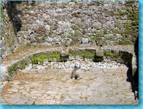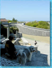 どうしようもない渋滞をなんとか抜けて、やっとたどり着く那覇で一番の観光名所。 日当たりの良い丘の上、城壁は白い天然石。地面は石畳か芝生。つまり、暑〜い。眩し〜い。地下の駐車場(時間制限あり)に車を入れて、場内に入る前から、少し歩いただけですぐさま木陰に避難。湿気はないから木陰に入るととたんに寒いくらい。気持ちよい風も吹き抜けます。もくれんは水をがぶがぶ飲んでました。 本殿などの有料エリアにはもくれん入れないので、長居は無用。木陰から日陰物陰岩陰と渡り歩いて即、退散。 犬連れだとただの公園ですが、ホントは中に入って一通り目を通すべきトコロかと。思います。 |